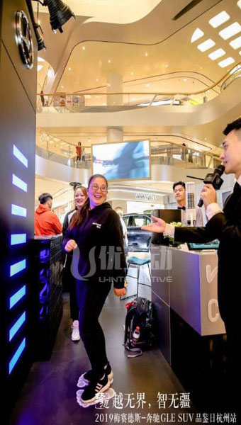 脚踩互动是通过压力传感器LED灯带控制,体验者左右脚交替踏地,就会点亮灯箱,加快频率,点亮越快,能量积攒到一定程度,即可点亮能量柱,用以展现48伏智能机电系统,为系统性电气化技术带来的出色的驾驶体验,集成式起动机,发电机推升,回收能量等特点。