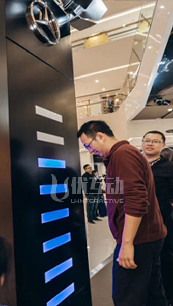 采用压阻式压力传感器,信号传入单片机指令系统,操控LED灯带控制系统,体验者可连续蓄力连踩互动,灯带连续累加亮起,灯带会根据连踩力度和间隔,显示不同的效果,用以模拟展示新品汽车的机电混合系统带来的出色驾驶体验。